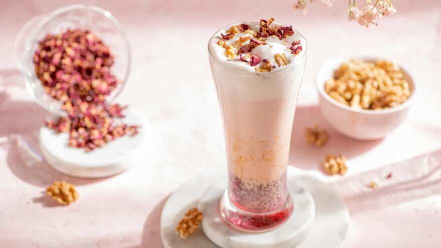 - Add the chilled rose walnut milk. Add a scoop of vanilla ice cream on top.