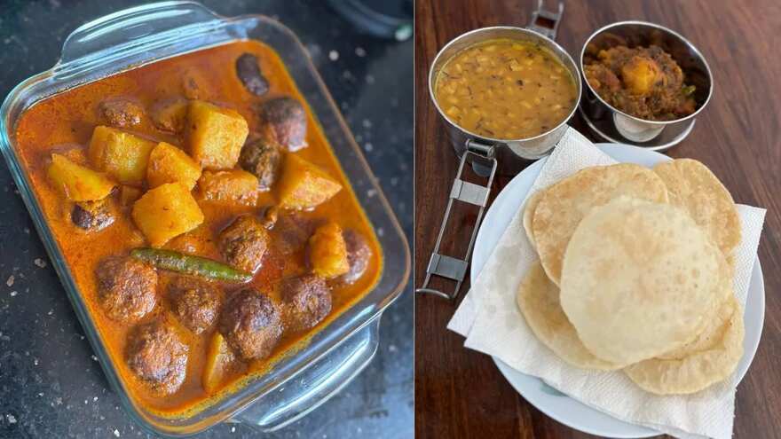 This day meant an elaborate vegetarian breakfast for the family. The spread included - luchi/kochuri (puri), cholar dal (chana dal), and aloor dum (potato curry), followed by lunch of either khichuri, labra (mix veg), beguni (eggplant fritters), chutney, payesh (kheer) or other vegetarian fares like narkel-posto bora (coconut poppy seeds fritters), potol posto (pointed gourd dish), chhanar dalna (homemade paneer kofta gravy). Men in her house were responsible for sourcing fresh ingredients from the market, while women were used to cooking. Continuing the tradition at her house, she is the one who takes care of breakfast and lunch meals with her mother. "Maintaining my family customs and rituals, I make sure to follow the first day of Pujo exactly as it was during my childhood in spite of a busy lifestyle," she added