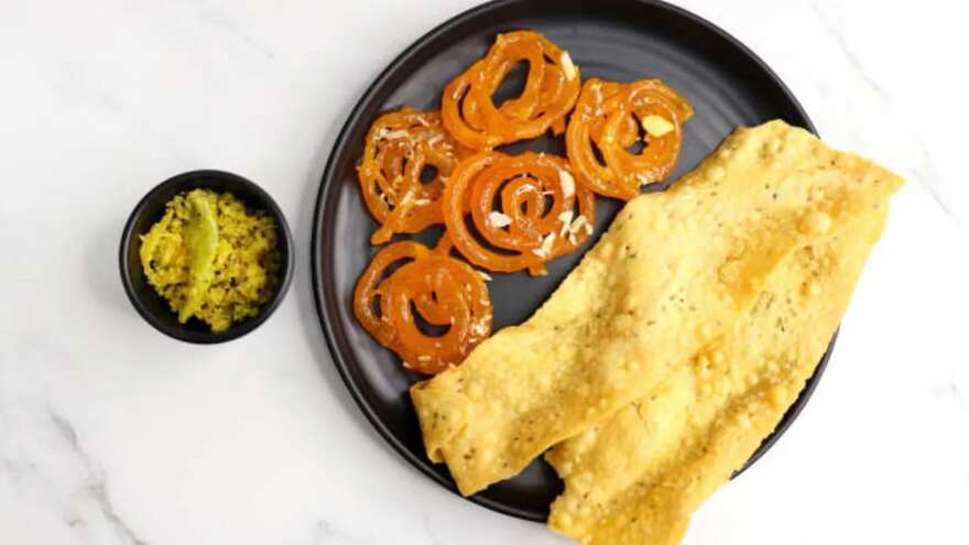 In Gujarat and Maharashtra, Vijayadashami begins with the sharing of faraal, which includes savoury snacks and sweets. One of the most iconic pairings in Gujarat is fafda with jalebi, which has become strongly associated with Dussehra morning. Fafda is a crisp chickpea flour preparation, while jalebi is made with fermented batter fried into spirals and soaked in syrup. Families in Maharashtra often prepare poha with jaggery and coconut or simple festive sweets such as shrikhand or puran poli. In many households, the practice of exchanging leaves of the Apta tree, also called sona, is linked with prosperity, and this exchange is often followed by a shared meal.