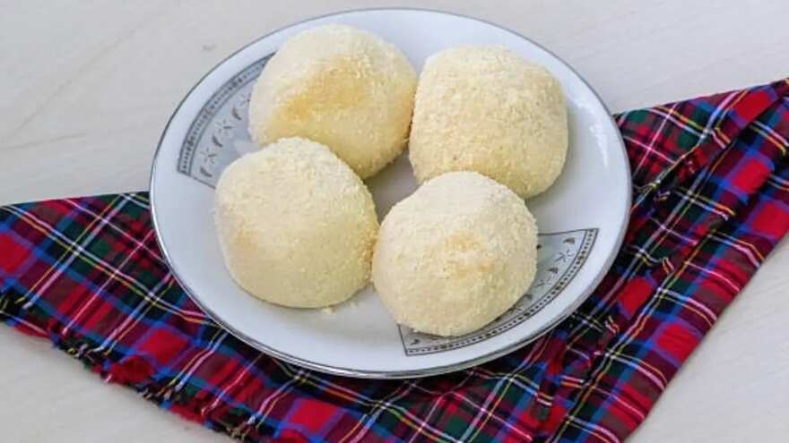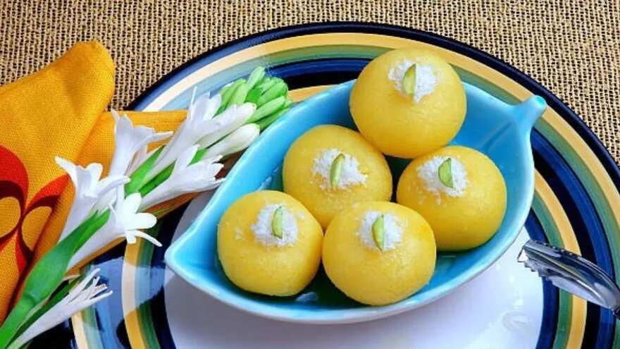 Naru is considered auspicious in a Bengali household during a puja. Grated coconut is blended with jaggery or sugar and rolled into chewy laddoos. Prepared on Saptami, Naru is the simplest yet most symbolic sweet, representing purity and devotion.