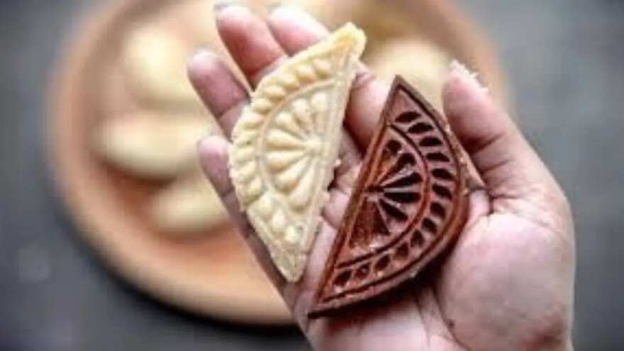 A crescent-shaped, deep-fried pastry stuffed with khoya, sugar, and dry fruits, chandrapuli delights with its crispy shell and rich filling. This Durga Pujo special sweet is specifically prepared on Ashtami and Navami evenings.