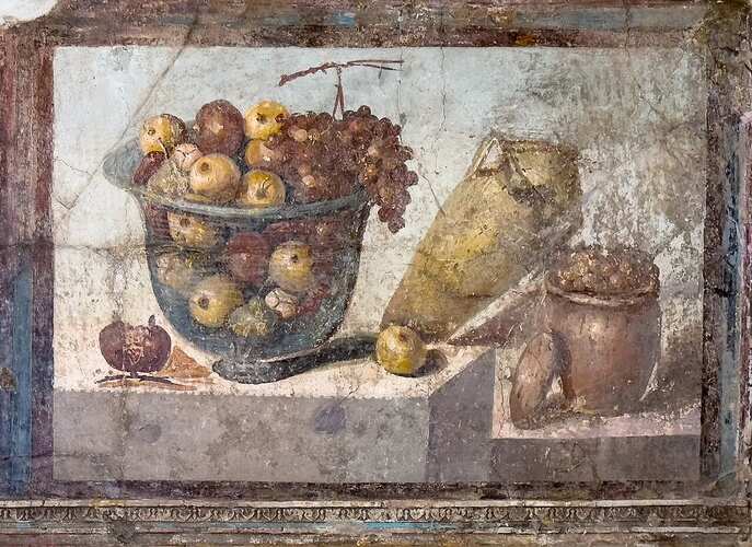 Still life fresco from Pompeii: A glass fruit bowl filled with apples, grapes, and pomegranates. In the middle, a small amphora for garum, and on the right, an olla containing Syrian figs. Wikimedia Commons.