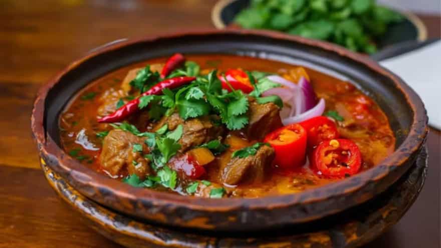 Goa’s traditional pork vindaloo, tangy with vinegar and tempering of spices, goes amazingly with fluffy sannas (fermented rice cakes). Eating by hand lets you tear the soft sannas and scoop up the spicy, tangy meat, which creates an enjoyable mix of flavours and textures. The heat of red chillies, the earthy aroma of cloves, and the tender texture of pork blend to make each bite rich and indulgent. This hands-on experience sweetens the joy of sharing a Goan feast.