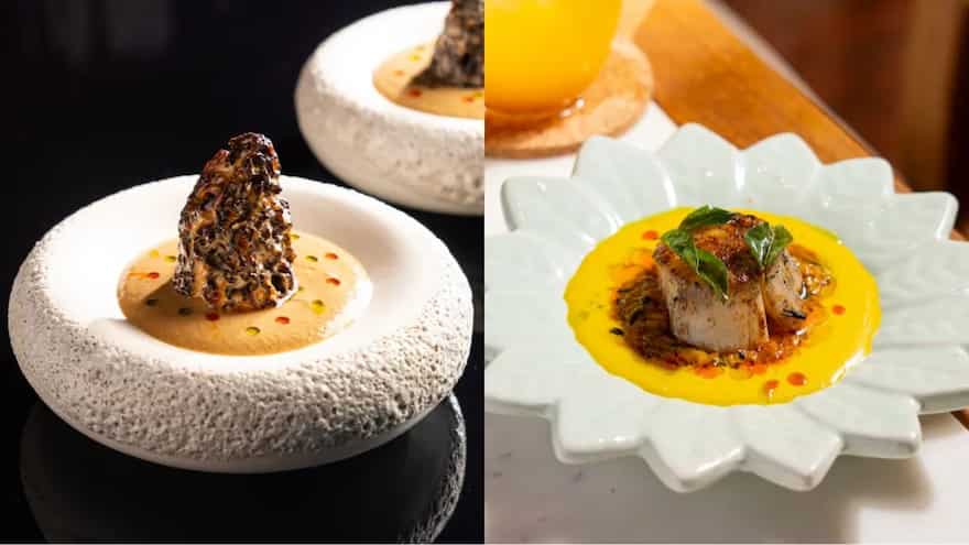 Elsewhere, stuffed morels swim in deep and drinkable mushroom nihari sauce, while embered scallops on a bed of coconut mud crab with a lime kuzhambu receive minimal treatment inspired by a Thrissur toddy shop, a deliberate showcase for the sweet proteins, unmasked by heavy spicing. The King Prawns are flamed to a crisp and slathered in butter and garlic with a generous dusting of gunpowder podi and curry leaves, leaving the meat tender and dripping in juice. Parsi cuisine goes east Asian with a patri ni machhi-inspired red snapper, wrapped in a banana leaf and grilled in a lemongrass green chutney, finished with a squeeze of grilled lemon. Meanwhile, the caramelised baby carrots perched on nimona foam prove that vegetables need not be virtuous to be delicious.