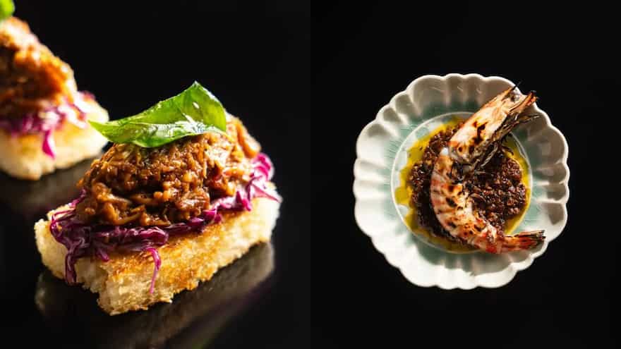 Udinia’s travels and experiences pour forth in the dishes on the tasting menu. The dahi bhalla chaat, inspired by his childhood in Delhi, arrives as an aerated foam, all lightness punctuated by satisfyingly crisp bhalla. The regional expansion continues with the Punugulu, a crispy fried fritter, native to Andhra Pradesh, but treated with a new take of prawns in rechad masala and an injection of balsamic vinegar. The tartness of the balsamic and cloud-like fritter with that kick of heat from the prawns recheado make for one delicious bite.