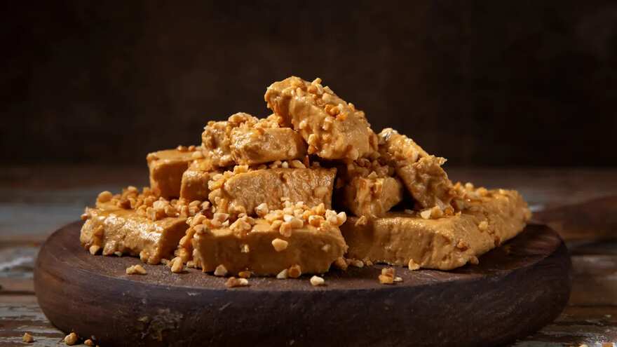 For this ‘snacking’ dessert, melt jaggery and water in a small saucepan over low heat to make these chewy squares. Simmer for 3–4 minutes to thicken the syrup. After thickening, add crushed roasted peanuts, a pinch of salt, and cardamom or dry ginger powder for flavour. Mix everything well to coat the peanuts in jaggery syrup. Flatten the mixture with the back of a spoon on a greased or lined tray. Cut the mixture into squares while warm and let it cool before serving or storing in an airtight container for a week. These squares are perfect for afternoon snacks due to their sweetness and nuttiness.