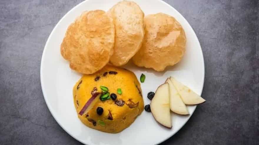 In many regions, the preparation of puri and suji halwa is an important tradition on Maha Ashtami. This combination forms the centre of kanya pujan, where young girls are honoured as embodiments of the goddess. Suji halwa made with ghee and sugar is believed to bring blessings of prosperity, while puris prepared with wheat flour reflect sustenance and simplicity. Together, this bhog is considered sacred and continues as a practice deeply rooted in customs followed for generations.