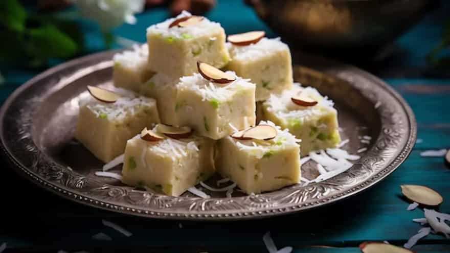 It is a sugar-free twist to the classic barfi that is prepared by combining grated coconut with dates, some cashews or almonds with a touch of ghee. Dates give the ladoos natural sweetness and a soft chewiness, while the nuts give a crunch. It is a festive sweet that is a light treat, prepared without refined sugar. Perfect for bhog thalis, coconut barfi with dates and nuts is both full of taste and custom in every bite.