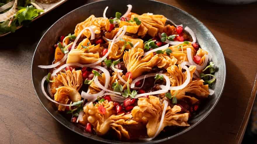 When she first made it, the taste was similar to samosa chaat. She thought of doing something better, and that’s when she made seven layers of butterfly-shaped crackers and arranged them around the chaat, boasting a perfect balance among sweet, tangy, and spicy notes.