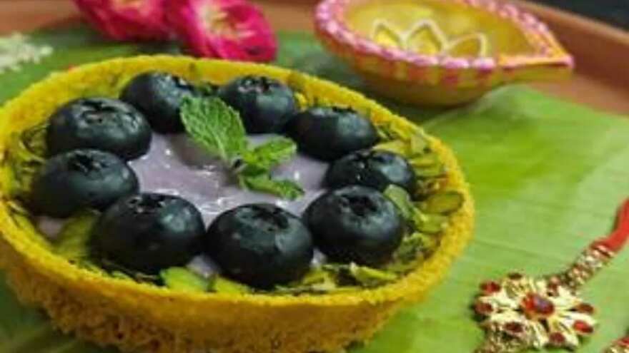 - Dip warm ghevar briefly in syrup. Top with pistachios, saffron strands, edible gold, and fresh blueberries.