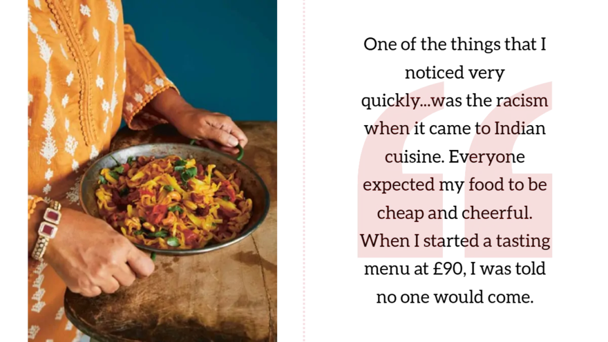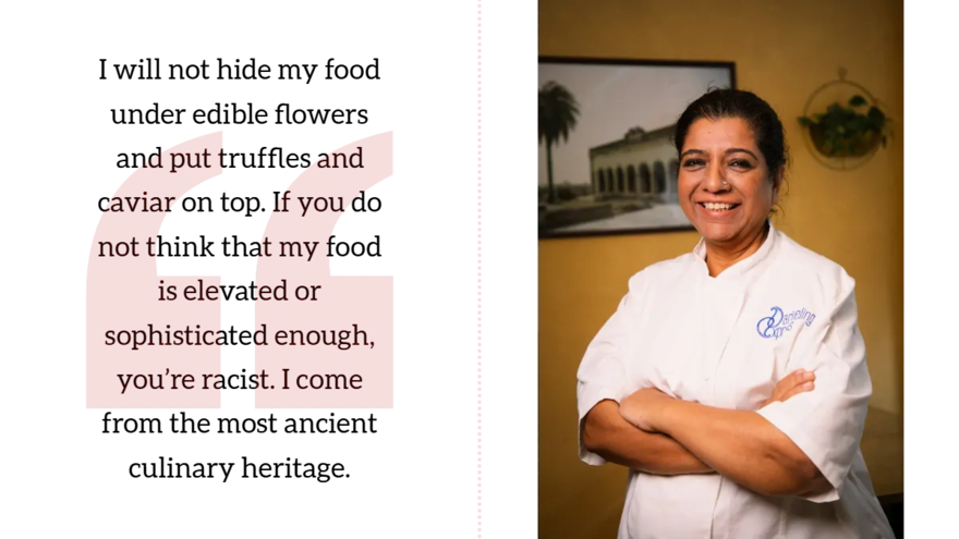 Her refusal to dilute her food and identity is uncompromising. “My food is brown, my skin is brown, and I am proud of both. I will not hide my food under edible flowers and put truffles and caviar on top. If you do not think that my food is elevated or sophisticated enough, you’re racist. I come from the most ancient culinary heritage… We were doing sophisticated food when you guys didn’t even know what food was,” she avers.